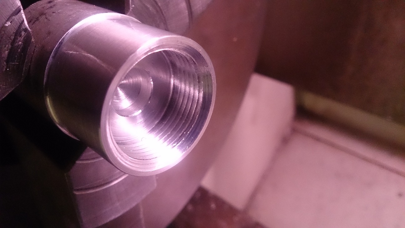 Silindri ots on tegelt 23,5 mm lm, kuid seda on piisavalt, et M24 x 1,5 keere kannaks. Lasin tagumise otsa 24mm siledaks, kuna see laugjalt laiemaks läks. Nii jääb korgile löppu sile puutepind. Olgugi, et selle esimese lahtilöigatud silindri puhul ma kasutan korgi puutepinnana hoopis puksi ranti, kus sees 4mm mansett on.