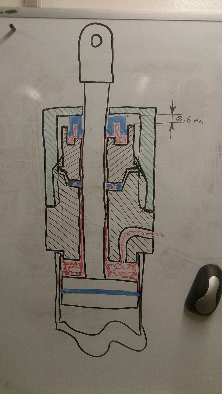... pölve sees on kalibreeritud ava, millega reguleeritud silindri liikumiskiirus. Pildil jäi too nöelasuurune  ava väga alla äärde, sest eespool paistis algul kena paari mm-ne ava, lambiga sisse uurides ilmnes aga see "nöela-auk".