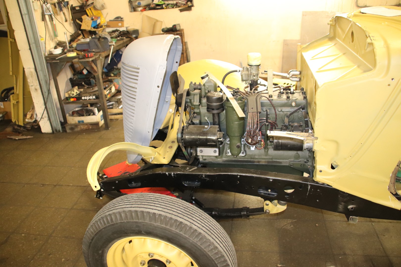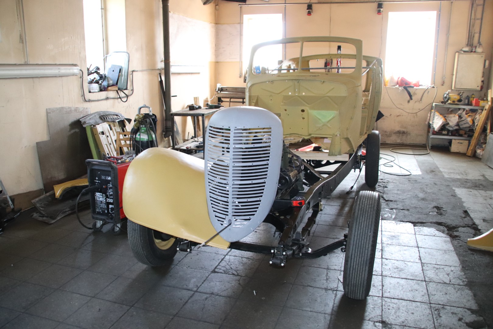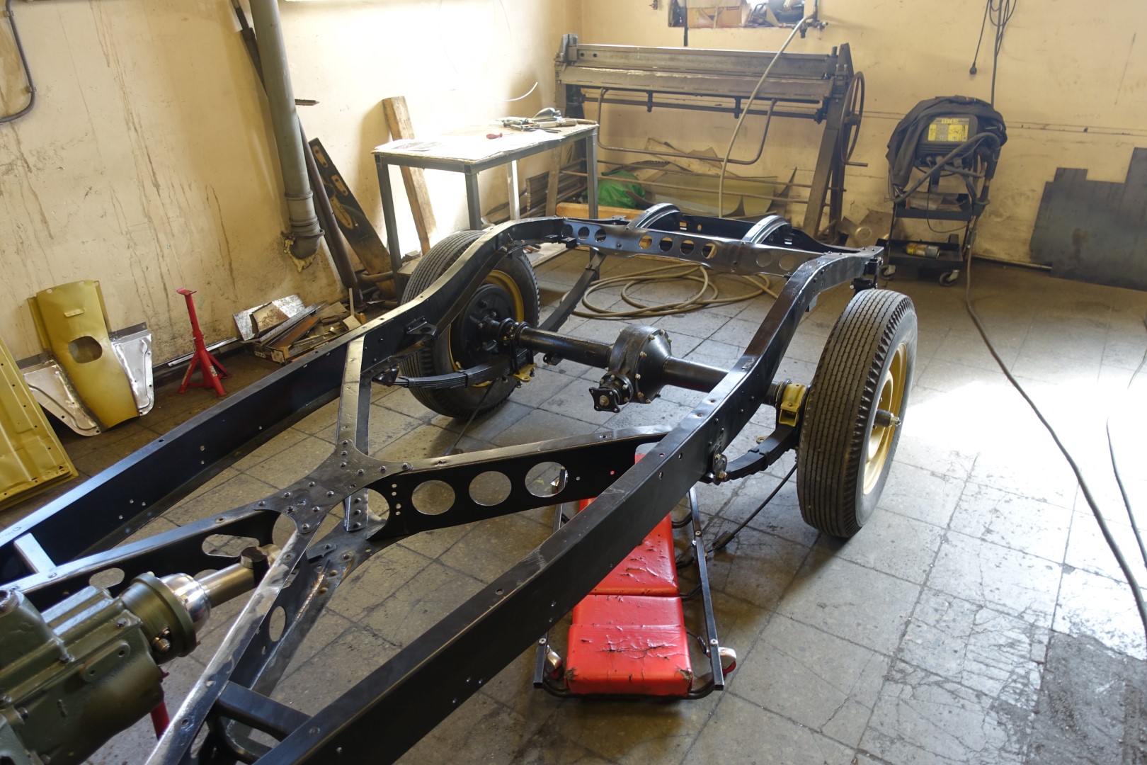 Kere sai raami peale tõstetud prooviks ja sobivuse hindamiseks. Kuna raamil puuduvad kõrvad kere kinnituseks ja mittesobimusi on veel, siis jõudsime otsuseni, et kõigepealt tuleb komplekteerida raam sildade ja mootoriga, et veenduda täpses kere asukohas ja et mitte millegagi mööda panna. Kuna Jänkid kasutasid ristivedrusid aga enamlased piki vedrustust, siis on raami tagumine kaks kolmandikku Vene variandil tolli võrra kitsam. See tähendab, et raami kinnituskõrvad tuleb teha tiba pikemad. Tõenäoliselt oli see probleem omal ajal ka selliselt lahendatud. Kahjuks pole arhiivist leitud ka GAZ 11-40 raami jooniseid. Lihtsalt on kirjas, et on mõningad erinevused, võrreldes GAZ 11-73-ga ja et raami tugevduseks on paigaldatud täiendav risti tala. Kus, milline???. Ühesõnaga niikaua, kui transmissioon saab komplekteeritud, tegeleme ustega. Uste jaoks teen hiljem uue postituse.