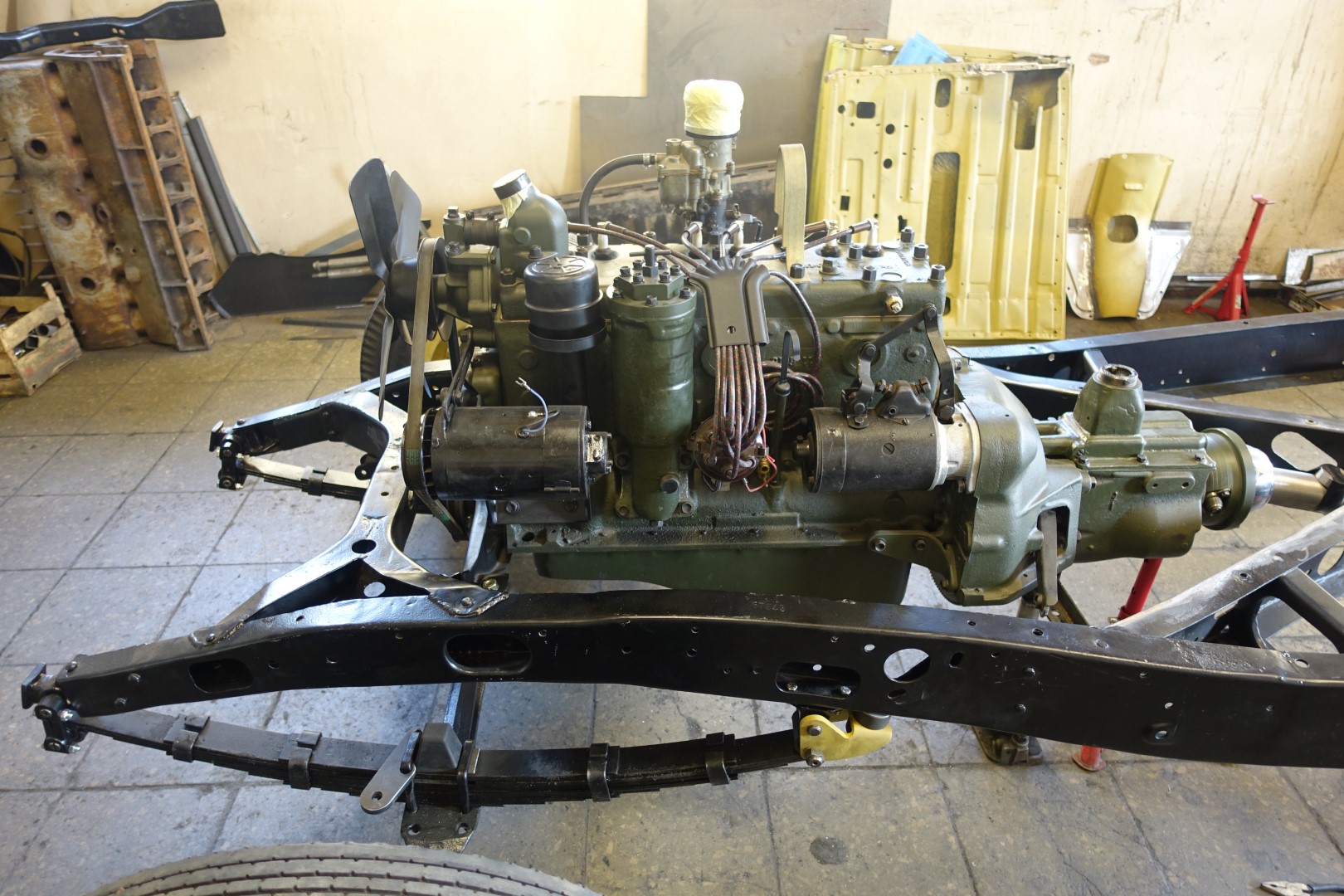 Kere sai raami peale tõstetud prooviks ja sobivuse hindamiseks. Kuna raamil puuduvad kõrvad kere kinnituseks ja mittesobimusi on veel, siis jõudsime otsuseni, et kõigepealt tuleb komplekteerida raam sildade ja mootoriga, et veenduda täpses kere asukohas ja et mitte millegagi mööda panna. Kuna Jänkid kasutasid ristivedrusid aga enamlased piki vedrustust, siis on raami tagumine kaks kolmandikku Vene variandil tolli võrra kitsam. See tähendab, et raami kinnituskõrvad tuleb teha tiba pikemad. Tõenäoliselt oli see probleem omal ajal ka selliselt lahendatud. Kahjuks pole arhiivist leitud ka GAZ 11-40 raami jooniseid. Lihtsalt on kirjas, et on mõningad erinevused, võrreldes GAZ 11-73-ga ja et raami tugevduseks on paigaldatud täiendav risti tala. Kus, milline???. Ühesõnaga niikaua, kui transmissioon saab komplekteeritud, tegeleme ustega. Uste jaoks teen hiljem uue postituse.