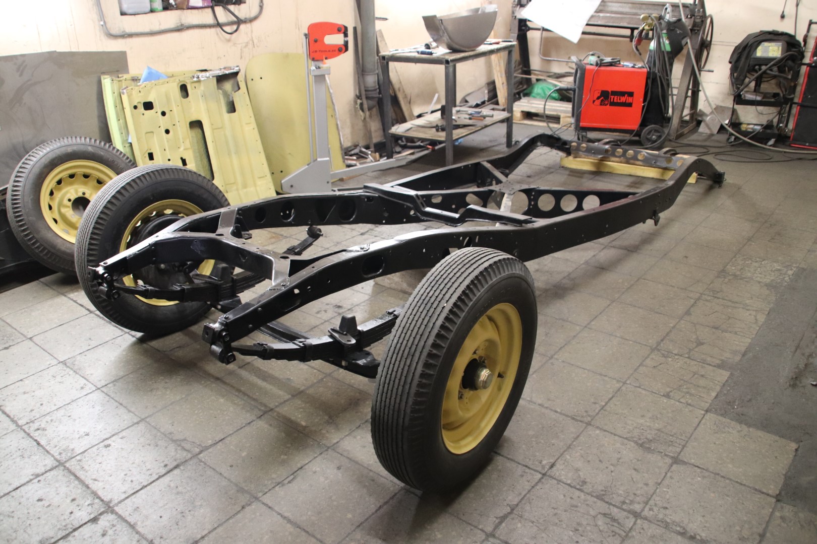 Kere sai raami peale tõstetud prooviks ja sobivuse hindamiseks. Kuna raamil puuduvad kõrvad kere kinnituseks ja mittesobimusi on veel, siis jõudsime otsuseni, et kõigepealt tuleb komplekteerida raam sildade ja mootoriga, et veenduda täpses kere asukohas ja et mitte millegagi mööda panna. Kuna Jänkid kasutasid ristivedrusid aga enamlased piki vedrustust, siis on raami tagumine kaks kolmandikku Vene variandil tolli võrra kitsam. See tähendab, et raami kinnituskõrvad tuleb teha tiba pikemad. Tõenäoliselt oli see probleem omal ajal ka selliselt lahendatud. Kahjuks pole arhiivist leitud ka GAZ 11-40 raami jooniseid. Lihtsalt on kirjas, et on mõningad erinevused, võrreldes GAZ 11-73-ga ja et raami tugevduseks on paigaldatud täiendav risti tala. Kus, milline???. Ühesõnaga niikaua, kui transmissioon saab komplekteeritud, tegeleme ustega. Uste jaoks teen hiljem uue postituse.