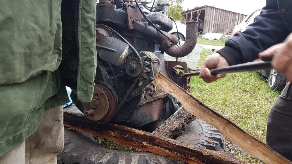 Kinnise mootori käima saamiseks soovitati pihustid maha keerata, silindrid petrooleumi täis valada, päeva liguneda lasta ja siis vakselt nõksutama hakata. Nii saigi tehtud aga asi oli kinni nagu luu. Vända otsas oleva rihmaseibi mutrist keeramine ei õnnestunud, sest sealt oli võimalik mutrit ainult lahti ja rohkem kinni keerata. Sidurikorvi vahele varda toppimine ja sealt nõksutamine ka tulemust ei andnud niisiis tuligi starter maha võtta ja sõraga hammasvööst väänata. Õnneks hammas ära ei murdunud ja vaikselt hakkas edasi-tagasi logisema kuni päris vabalt liikuma sai.