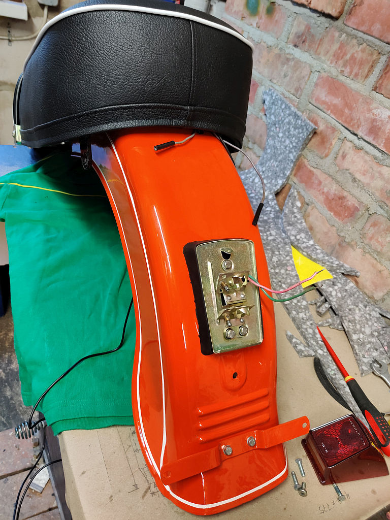 Elektrisisteem on ka nüüd lõpuni valmis ja testitud. Sadulaaluse üksikutest pistikutest koosneva tagatulede ühenduskomplekti asendasin lukustuva PC toiteploki pistikuga. Otsisin kohalikult turult ka PVC juhtmetoru ja küünlajuhtmete omavaheliseks fikseerimiseks plastklambreid, kuid kummagi ei leidnud siit ja tuli inglaste maalt tellida. Esimesed on küljes, teised veel tulemata. Samas olen kas kaotanud või kogemata visanud ära tulede lüliti P25-A kinnitusklambrid juhtrauale. Sai teine ära taastatud, aga pole millegagi enam kinnitada... Seoses viimasega on lausa kaks palvet. Kas kellelgi leidub korralike klambreid mainitud lülitile ja kas leiduks ka ühte tervet lülitit? Nimelt on plaan kasutada sarnast lülitit suunatulede jaoks (kui viimased ikka sobivad külge), oleks kuidagi ajastutruum.