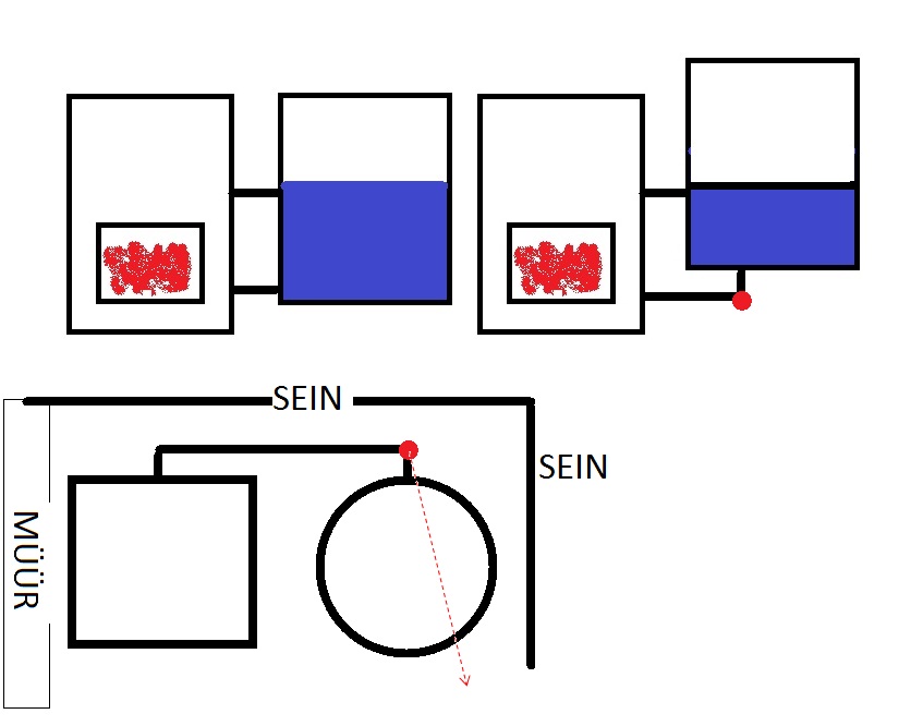 Teisel pildil siis tõstetud tünn, et ringlust tagavat minimaalset veekogust vähendada. Punasega on märgitud tühjenduspunkt. Kolmas on pealtvaade, mis näitab, et ükski inimesemõõtu olend sinna punktini lihtviisil juurde ei pääse Sad Kriipsjoonega tähistatud lahendus(???) ehk täiendav toru, mille otsas oleks siis nii tühjendamiseks kui ka veevõtuks kraan. Minu kahtlus selles, kas selline sisteem ka häireteta toimib? Et lisatoru ei lähe fekaali täis? Kuivõrd võib abi olla mudakogujast? Samas tuleb mudakoguja paigutada kraani juurde, sest punase punktiga positsioonis ei pääse talle juurde.
