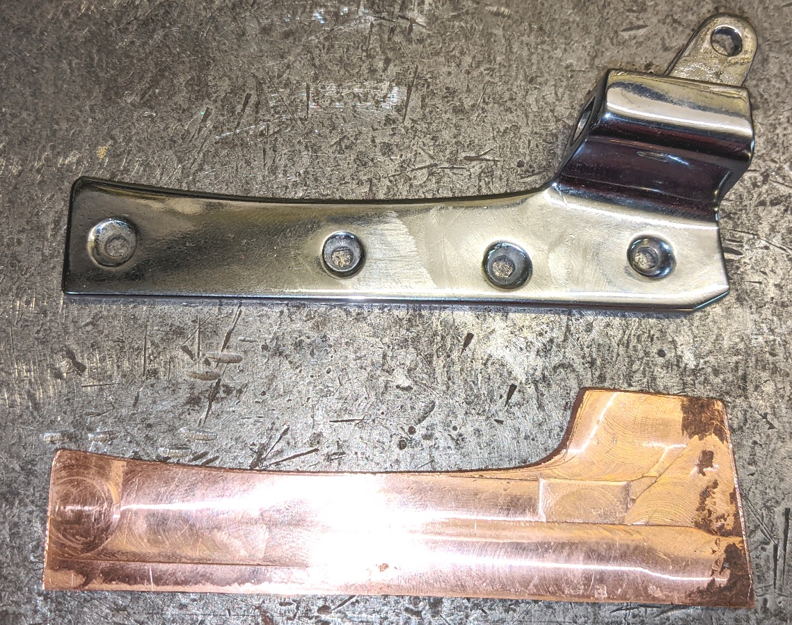 Sai varem kurdetud, et Audi katusekinnituste komplekteerimiseks on vaja korda teha DKW katusekinnitused. Valgevase plaadi või lati leidmine osutus keerukaks, kasutasime vaskplaati. Täna sai õige paksusega plaat välja freesitud, õigesse mõõtu lõigatud ning kinnituskronstein plaadi külge kinnitatud. Edasine on juba Narva meistrite töö - tükid kokku joota, paarilisega samasse mõõtu ja kujusse voolida ning kroomida. Hea, et neid vajalikke kinnitusdetaile mujalt ei leidnud - oli põhjust DKW originaalsemaks teha.