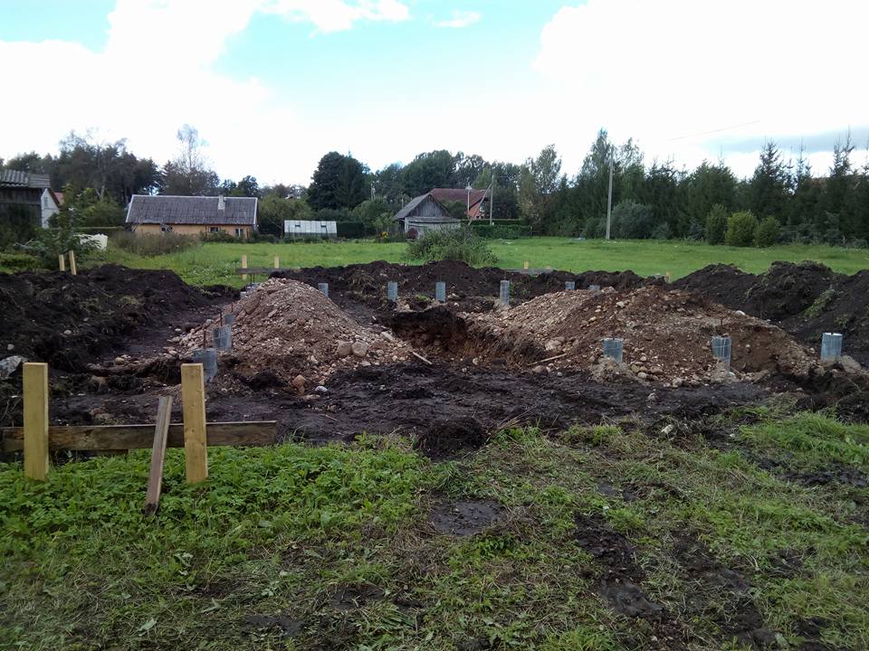 Alguses mõtlesin, et teen ilma pinnase koorimiseta, aga siis ei andnud hing rahu, sest tegemist kunagise põllumaaga ja mulla kihti oli liiga palju. Kohati lausa pool meetrit. Allpool mulda on kõik puhas kruus. Maakera loomisest saadik. Elan kruusavöö peal. Eemaldatud mulla asendasin liivaga ja väljapoole vundamenti jääva osa täitsin tagasi samuti liivaga.   Postid on seega pooleldi kruusas, pooleldi liivas olenevalt maakera kumerusest.