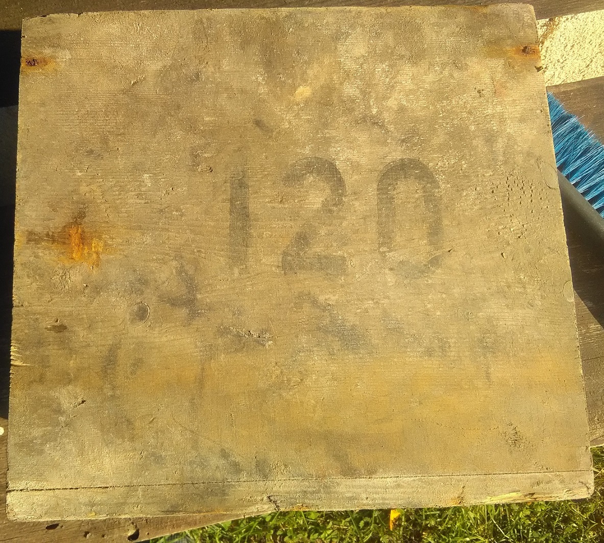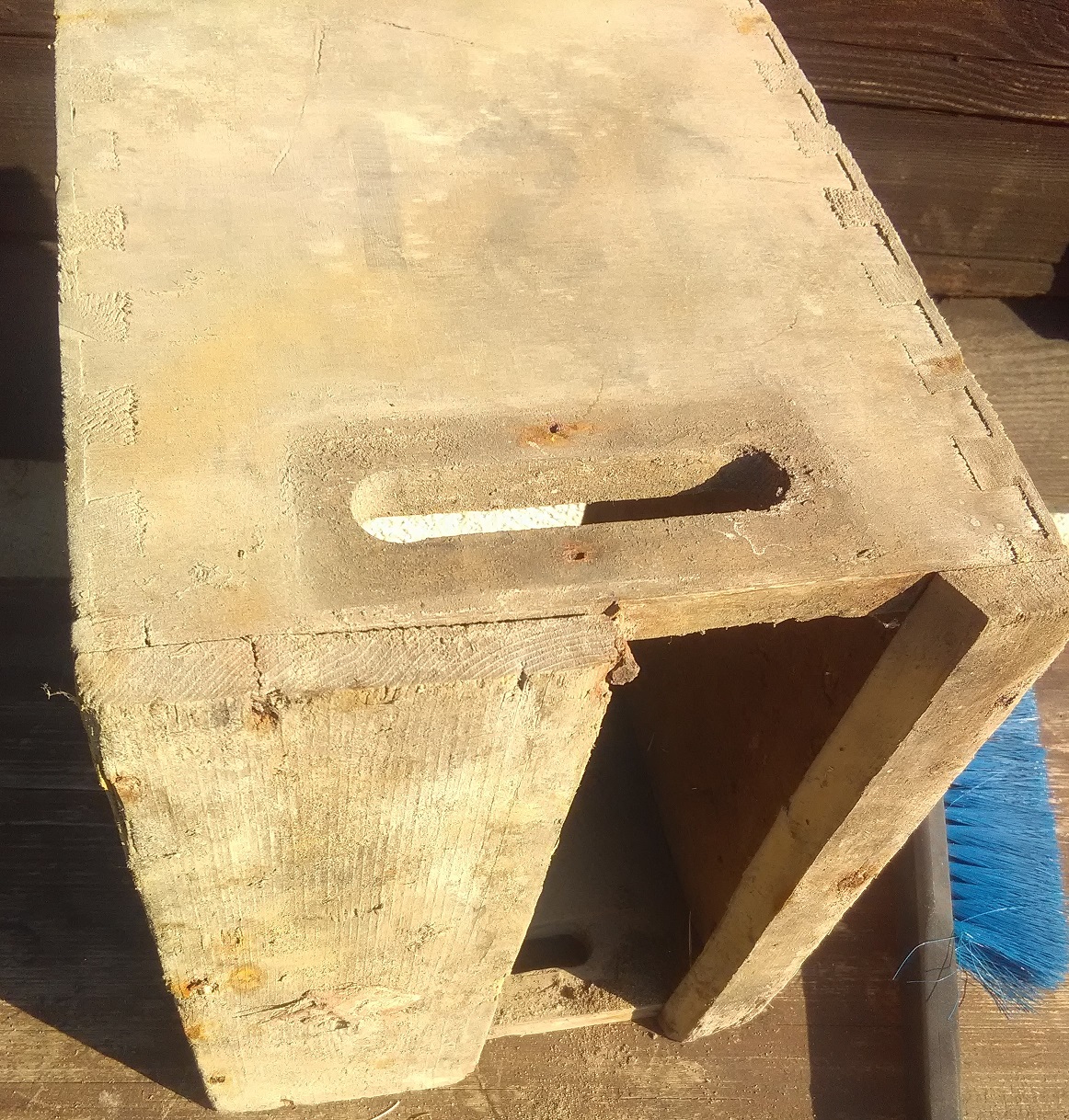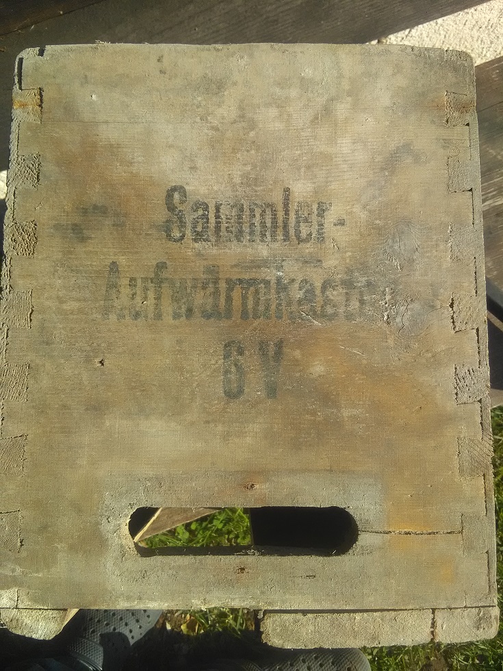 Esimene kast on puidust ja see on olnud akukast, külg umbes 40x40cm, teine külg kitsam. Mõned kirjad peal ja ka saksa kana on ühes servas. Põhjast üks laud puudu.