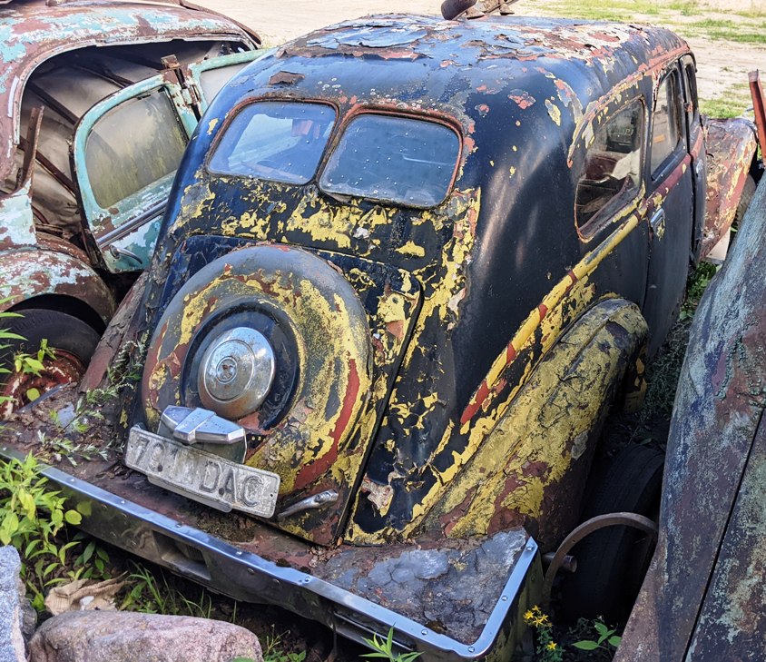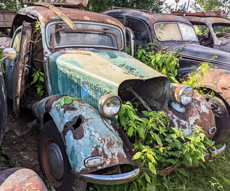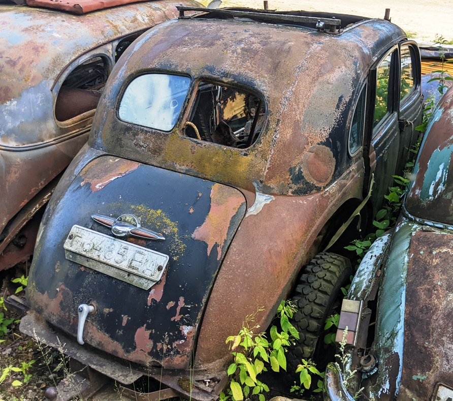 Esimesi DKW pilte vaadates tunduski, et seal on seda kraami veel. Tundub sama masinapark, mis kunagi Tartus Viljandi maanteel ühel territooriumil ülesse rivistatud oli. Samas mõtlesin ka selle Peugeot peale, mida esimest korda põrsapõlves Võru lähedal seismas nägin. Läks millegipärast hinge see stiilne disain. Kahekohaline mudel pole 402, vaid DK5, mis oli esivõre pealt loetav, kui see veel küljes oli (vt http://eag.vanatehnika.ee/a-pr/PeugeotDK5-b.jpg). See on masin mida endale tahaks, aga käed jäävad liiga lühikeseks ja ebaosavaks. Vabandan nostalgitsemise pärast, olgu roosteuss talle armuline.