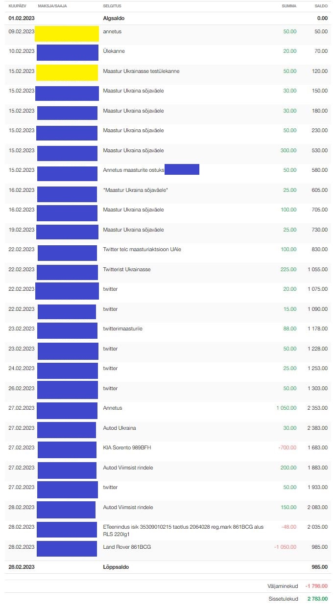 Otsustasime, et kõige läbipaistvam on panna meie toetuskonto väljavõte anonümiseeritult (nimed ja kontonumbrid värvitud) siia iga kuu lõpus avalikult üles.