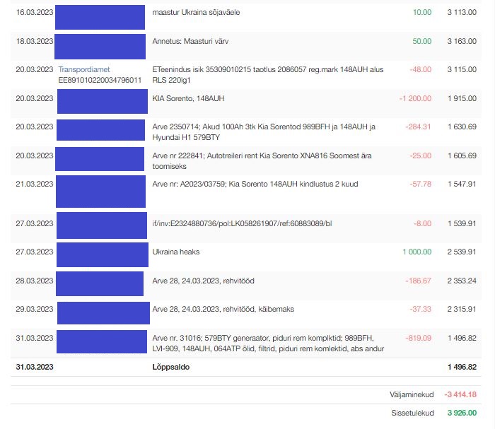 Arvel ei kajastu kõik maksed. Osaliselt oleme tasumiseks pidanud kasutama sularaha (transportimised, eraisikutelt varuosad jms) või vahel on poest midagi kiiresti vaja. Neid kulusid oleme rahastanud vanarauast teenitud raha eest või oma arvelduskontolt.