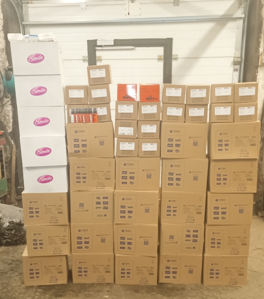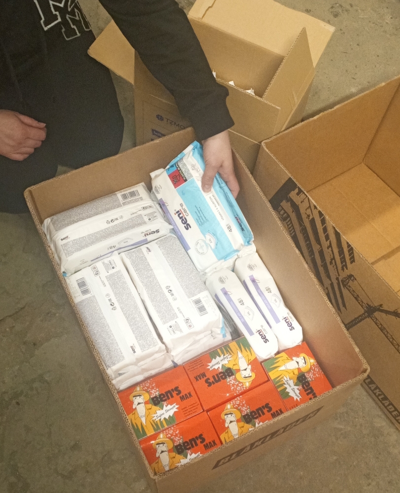 Pakkisime tiba asju, et oleks mugavam Ukrainas asju laiali saata. Kolm suurt kasti lähevad postiga kolme eri kohta. Nendes sisaldub 10 kasti salvrätte ja 14 karpi sääsetõrjet. Väiksem kast on Sorondi varuosad, mis on tihendatud salvrättidega, läheb Volodimirisse koos ülejäänud sääsetõrje ja 16 kasti salvrättidega. Sealt saadetakse edasi. Viimasel pildil nähtava hunniku pappi jätame endale.