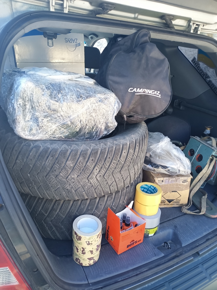 Pildil: Tüüpiline koorem üleantud maasturil – varurehvid, mootorsaag, teip sääsetõrje, plaastrid jms.