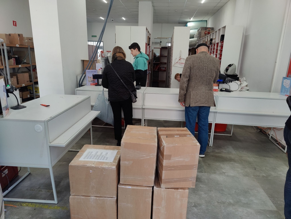 Pildil: Saateautoga kohaletoimetatud abipakid ootamas ärasaatmist Volodimiri postiasutuses.