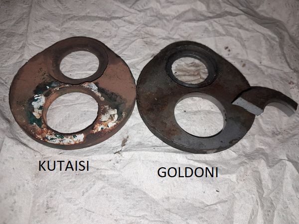 Paremal ülal näeme miinuspeaga stopperkruvi, sinjoorid kasutasid sisekuuskantpead. Paremal olev üksik hammasratas pöörleb Goldonil pronkspuksil. Puksi näitab ka Kutaisi kataloog, aga ähmaselt meenub, et Kuta puhul sai sinna pandud nõellaager. Ei viitsi lihtsalt teadasaamiseks lahti ka võtta.