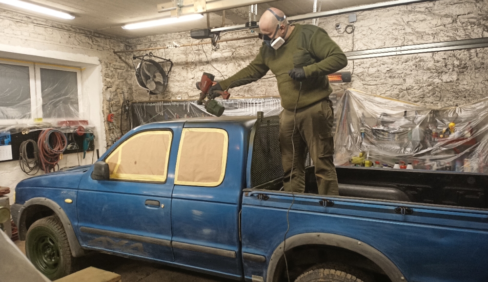 Töö parasjagu käib. Värvimise ajal järgitakse rangeid puhtuse nõudeid - autolt pudenenud essu ja roostet mitte näppida! Las vedeleb töökoja põrandal, kuni auto saab värvitud. Palju lihtsam on koristada, kui autot ees ei ole.