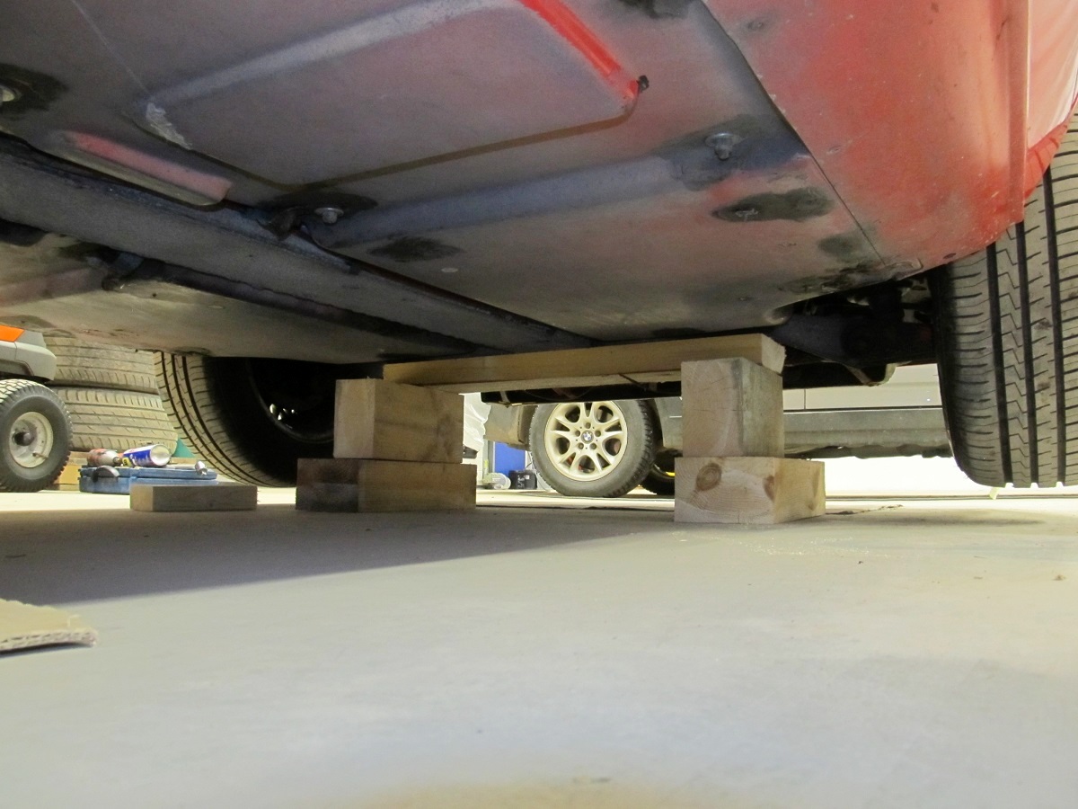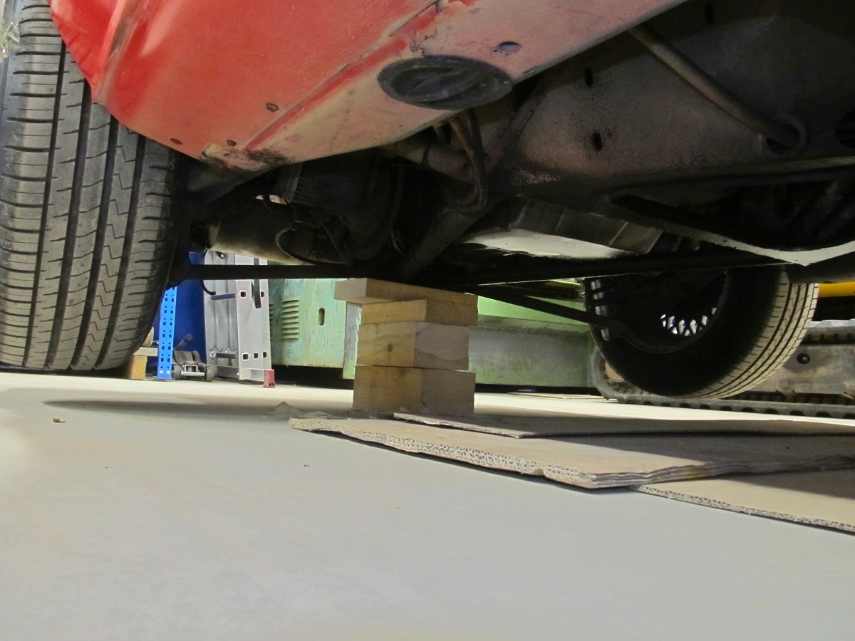 Autotõstukit mul veel ei ole. Seega peab põrandal püherdama. Esprit'il on tore T-tähe kujuline raam, kust leiab korraliku laia tugipinna. Raami esiosa T-osa alla sobitasin risti prussi, mis üles tõstetuna aitab autot stabiliseerida.
