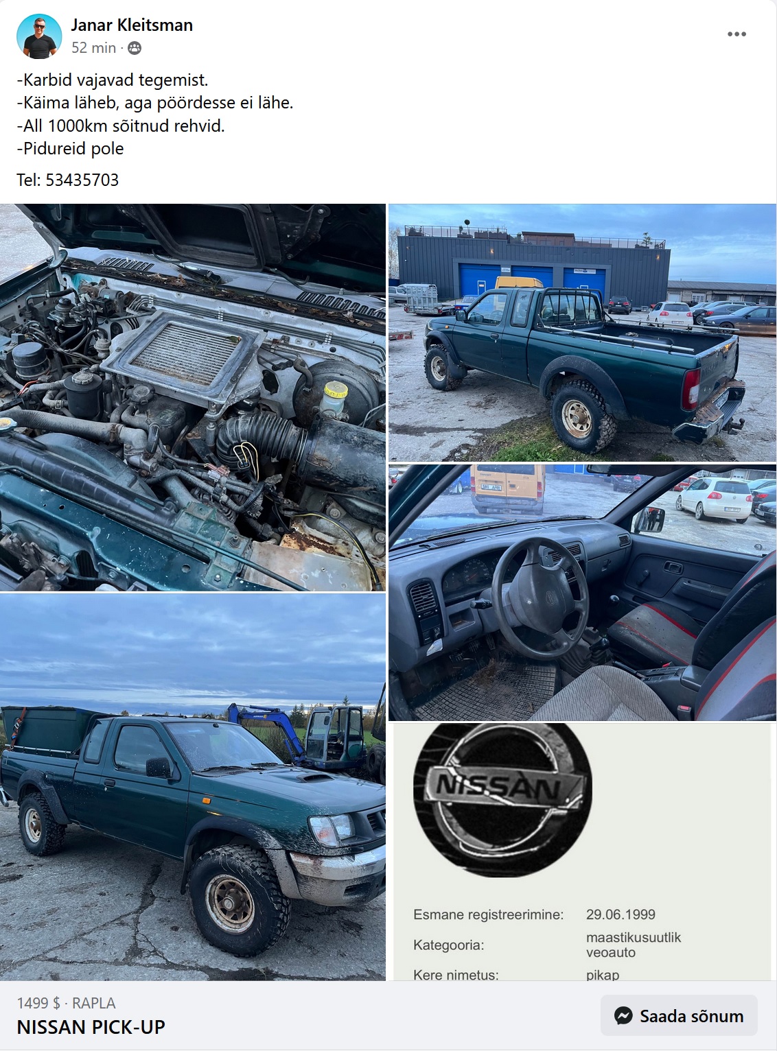 (18-10-2023, 12:03 PM)PlyVal64 Kirjutas: Sektiliikmetele ka üks pealtnäha täitsa söödav mudarehvidel Sooront Tõrvast. 1600€. Pidi isegi täiesti sõitma