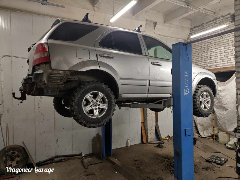 Kuna Galloper ootab parempoolseid tagatulesid ja tagumise stabikale aretamiseks juppe,et läbida edukalt läbivaatus,siis sai tõstuki peale aetud Sorento "rapla". Ütleme nii,et seda autot on ikka vägagi sihtotstarbeliselt metsas kasutatud. Mida kinnitas kärutäis mulda/heina ja paar suuremat paekivi sillatala peal  Big Grin Kiirelt sai ära lapitud ka pooleks olev tagastange.