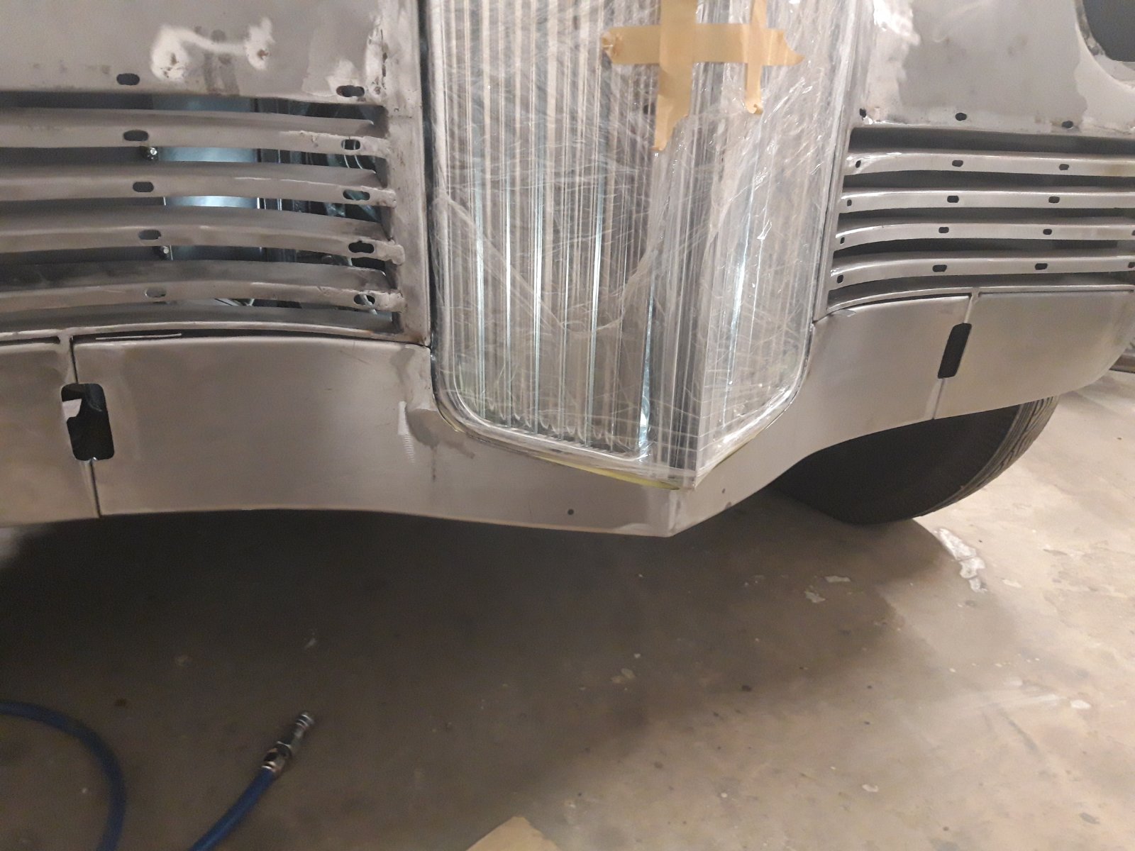 Esitiibasid ühendav plekk. Esistange tuleb selle pleki ette ja kinnitub läbi avade raami külge. Pildil on näha ka radiaatori esivõret.
