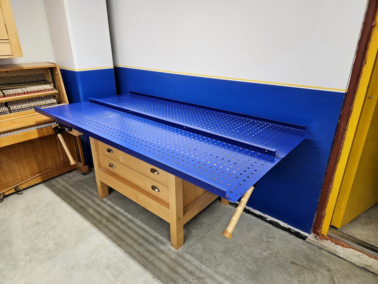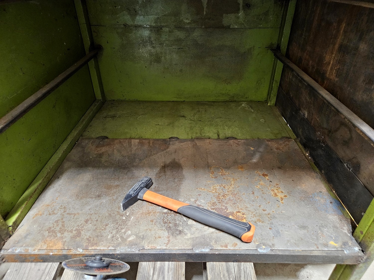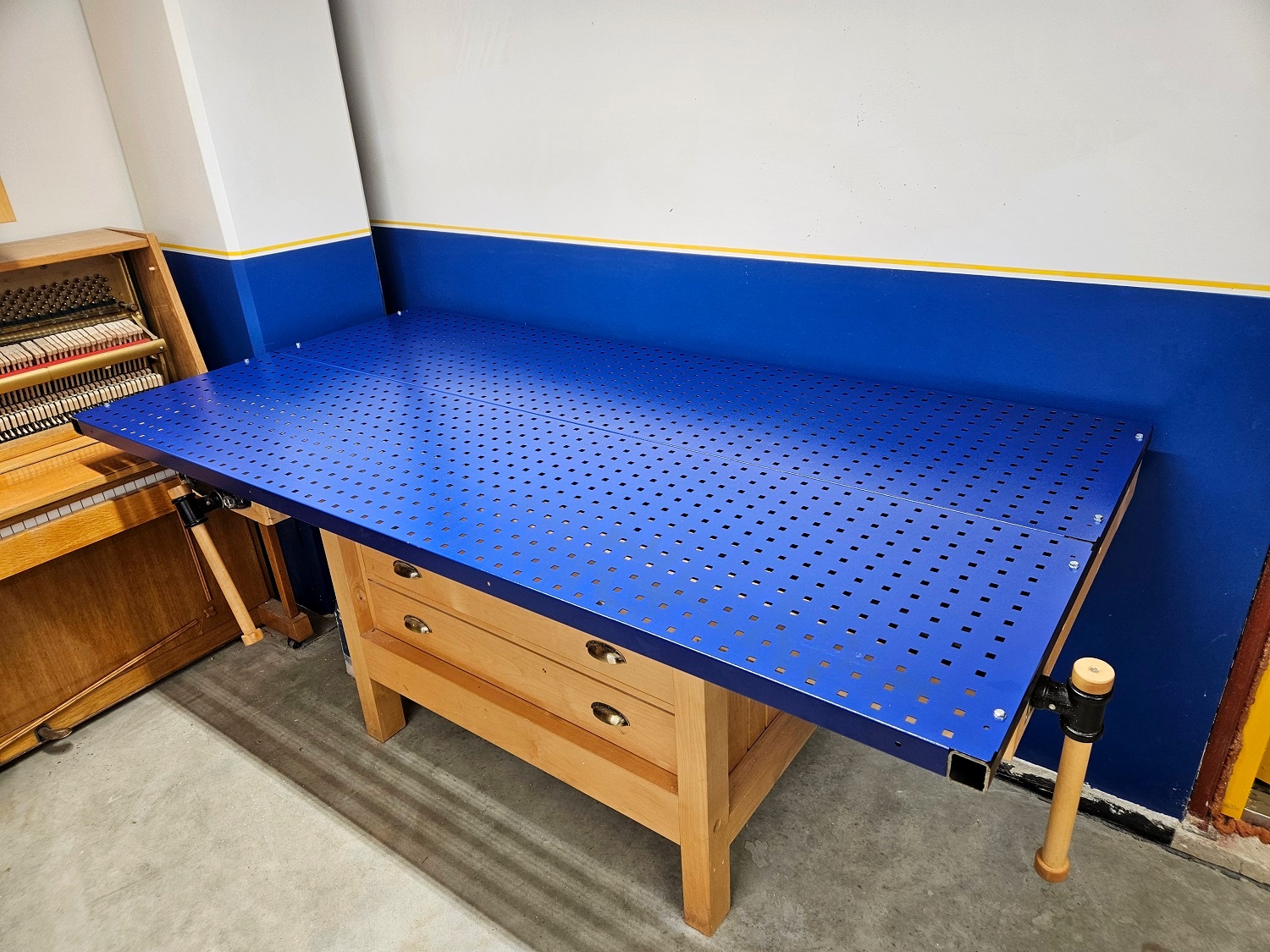 Töötasapinnal oli sellel laual alasina kasutatav plaat (vasakus nurgas) ning alasi (paremas nurgas). Kuna töötasapind ei ole väga lai, siis otsustasin, et suurema tööpinna huvides kruustange enam tagasi ei pane. Seega vanad kruustangide augud tuli ära kaotada.