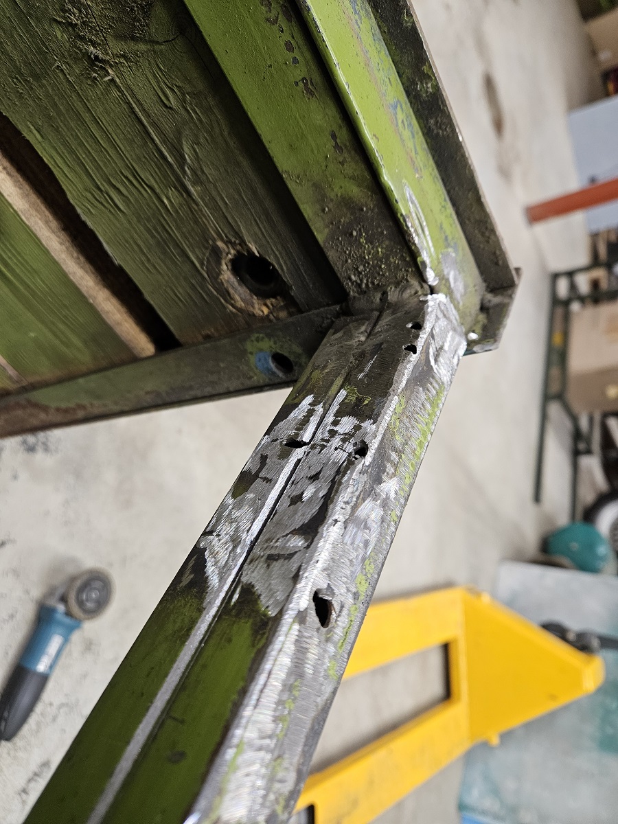 Tekkinud aukude kinnilappimine oli minu jaoks kõige vaevarikkam. Laua tugikonstruktsioonide valmistamiseks on kasutatud 2mm seina paksusega nelikanttoru ning seegi on juba üksjagu kannatada saanud ning seetõttu õhemaks muutunud. Töö tegemiseks aga kasutada vaid odavaim Telwini elektroodkeevitus ning suht kogenematu harrastaja. Tuleb tõdeda, et hakkama saamisega oli probleeme, tõsiselt palju probleeme. Mida õhem materjal, seda kehvemalt minu aparaat ennast tunneb ning kapriissemalt käitub. Päris mitu korda käis käpp kaarega juba nurka ning korra mõtlesin, et lähen toon poest MIG'i ära. Aga ikka rahunesin maha ning pusisin edasi. Õnneks on laua koostamise käekiri üsna karm ja minu töö ehk nii väga silma ei riivagi. Kui oleks vana asemele uue osa pannud, oleks tulemus silmale olnud palju ebamugavam vaadata.