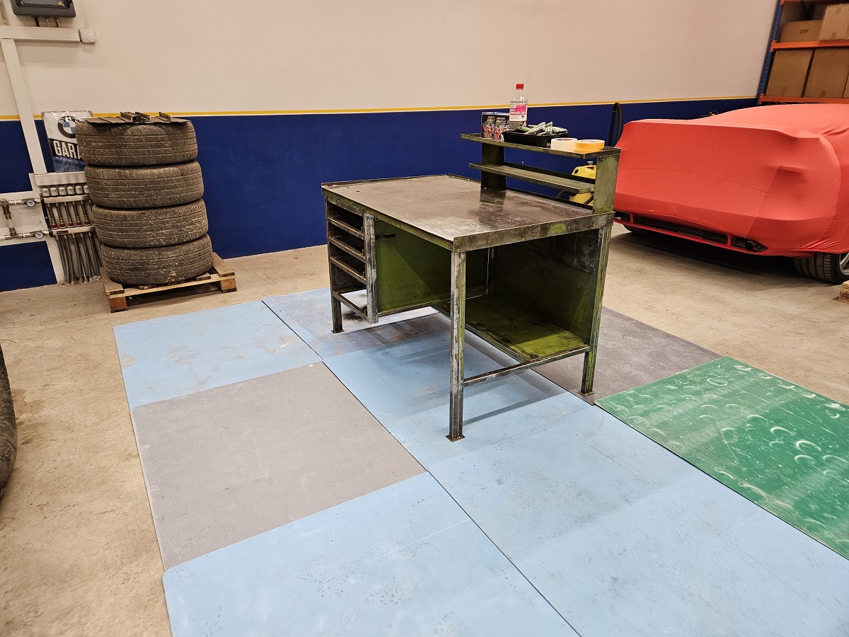 Plaan oli, et vean laua garaaži silma alla, küll siis aja jooksul mõni mõte ka tuleb, mis sellega pihta hakata. Liiga kauaks vedelema jäetud asjad kipuvad lõpuks mullaks saama. Seda ei ole vaja. Aga eelnevalt tegin asjale korraliku leotuspesu, sest lisaks õli- ja kütuselaadsetele ainetele, oli laud saanud pihta ka erinevate kemikaalide ja teab millega veel. Ühesõnaga on olnud tõsises sihtotstarbelises kasutuses. Siin, pärast esimest pesu, on juba hästi näha, mis modifikatsioone on tehtud. Parempoolsele osale on pandud lisa nurkrauad kas sahtlite siinideks või riiuliplaatide alusteks. Lisaks annavad hinged märku, et kunagi on siin ehk ka isetehtud uksed ees olnud. Parempoolne külgmine sein ja ruumi põhi on samuti hiljem lisatud.