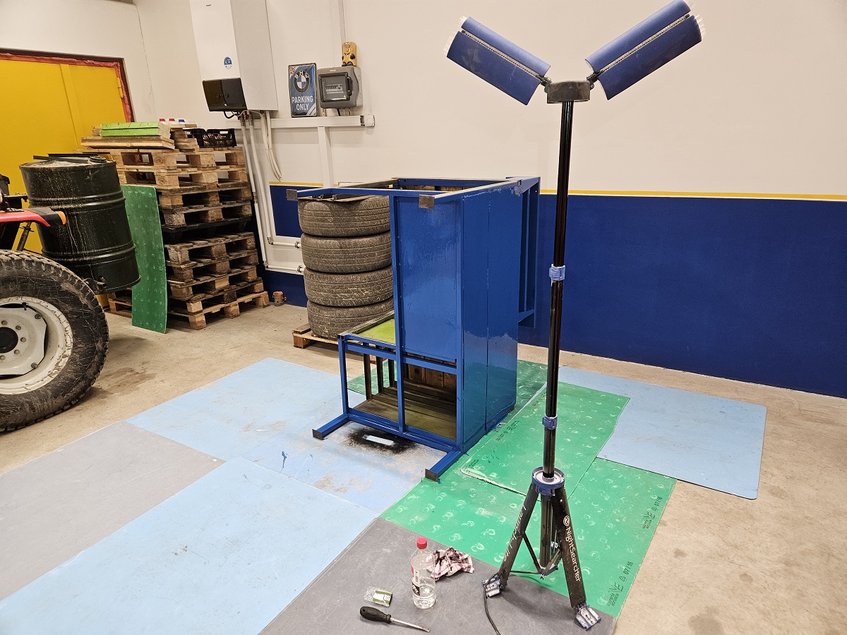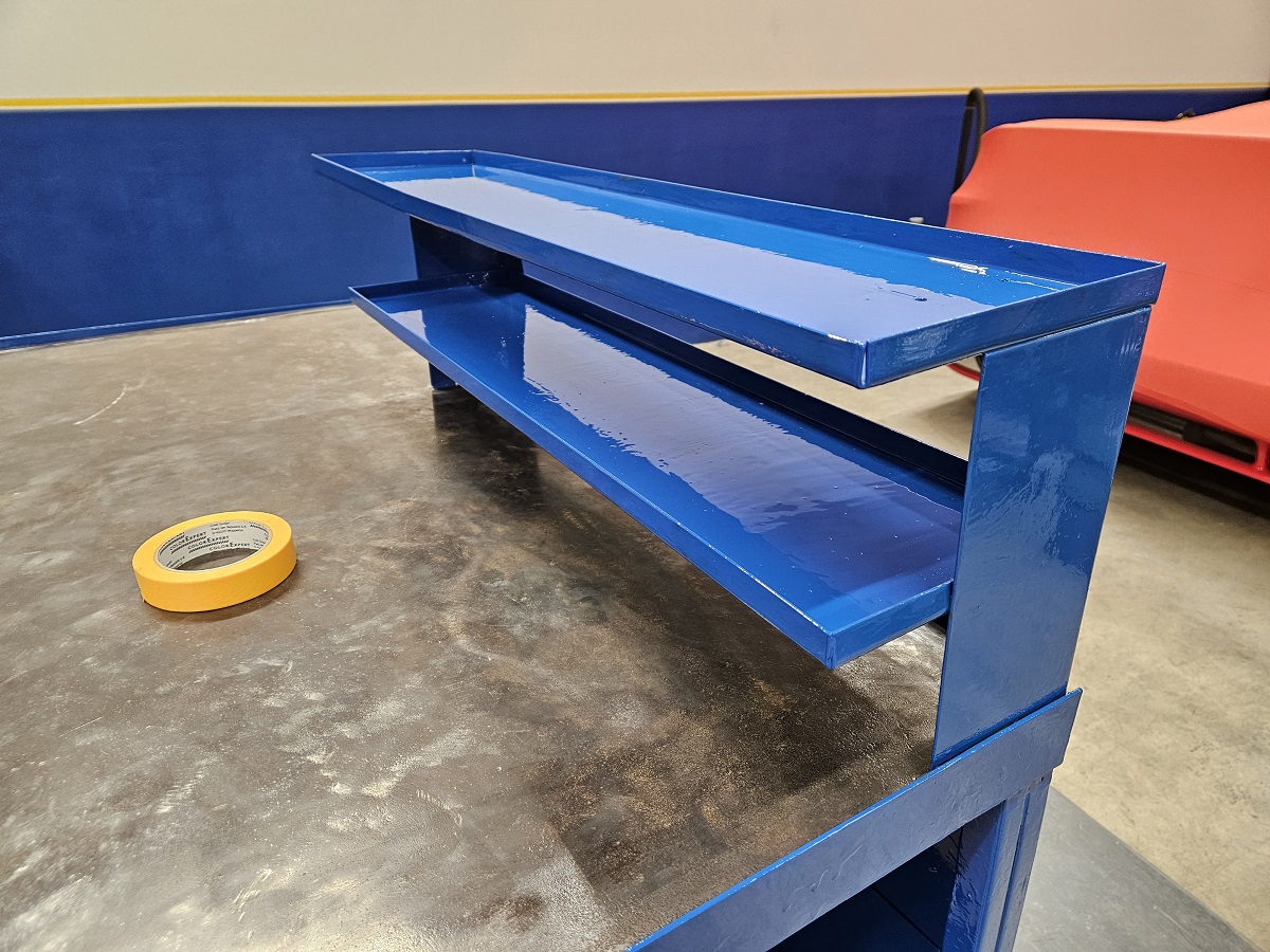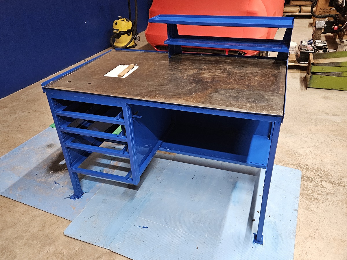Ning lõpetuseks värv peale. Ikka sinine, et teiste laudade ja tööriistastendidega sobiks. Fotodel värv värske ja väga läigib vastu. Kui ära kuivab, siis võtab natuke tagasi ning defektid hakkavad vähem silma. Üldiselt on tegelikkus pisut parem kui fotodel. Esmane kuivamisaeg on ca 2 päeva toatemperatuuril, siis saab juba käega pinda katsuda. Üldiselt on see värv üsna aeglane kuivama, kuid kui kuiv, siis peksa või haamriga. Seda peab aga kuu-kaks ootama.