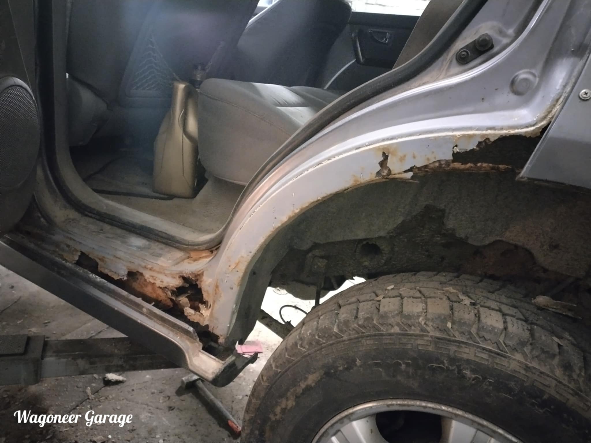 Tõstukil selgus,et raami juba keevitatud. Need risti torud ka korralikult uute vastu vahetatud. Aga raami tagaots on mäda. Loomulikult on ka karpide asemel makroflex ja mastiks. Paak ka lekib. Lisaks on tagaluuk totaalselt mäda nii ülevalt kui alt. Lapitud seda kilekoti ja pahtliga.