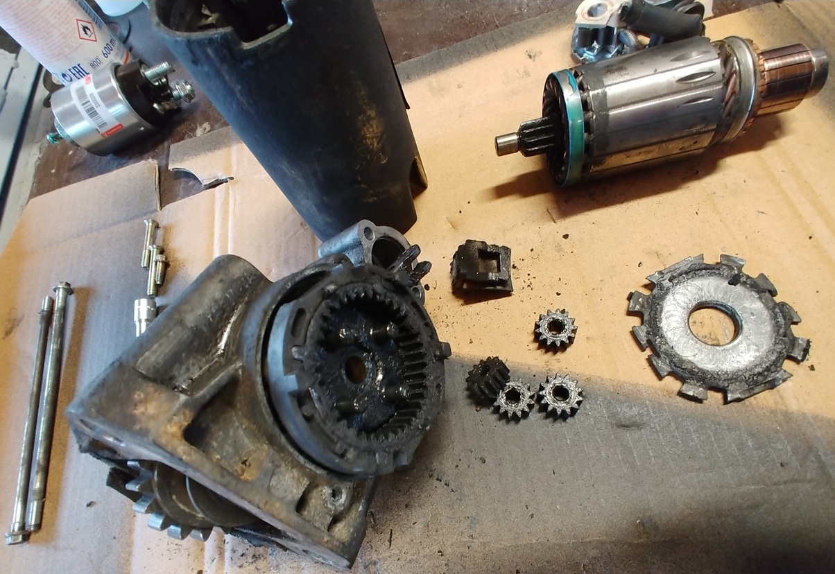 Starter peal tundub algupärane, vanust muidugi 19 aastat, sees oli palju harjade puru, puhastasin, paigaldasin korralikud uued harjad, uus tõmberelee, aga viga alles.