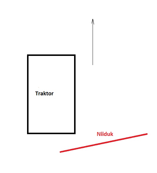 2. Pingutasin vikati välimise otsa ettepoole. Niidumasina vastav pinguti on ekspluatatsiooni käigus asendatud traktori roolivardaga. Selle pikkust muutes sain asja tehtud.