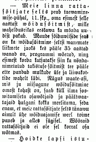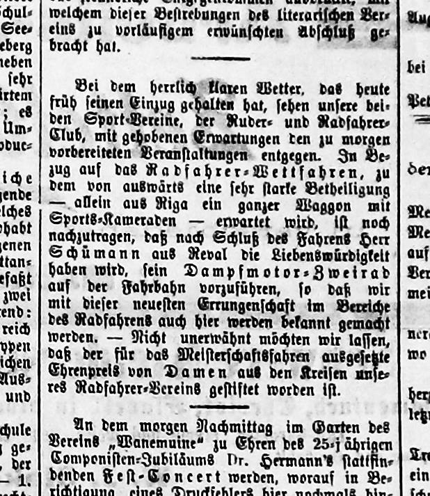 Jah, enamik neist uudisnupukestest refereerivad lühendatud kujul saksakeelsete zeitungite põhjalikumaid lugusid. Proovin ka neid postitada. Eriti üksikasjalike kirjeldustega paistab silma "Neue Dörptsche Zeitung" mille peatoimetaja Hasselblatt oli ühtlasi ka "Jurjewsche Radfahrer Vereini" juhatuses.
