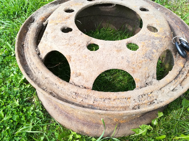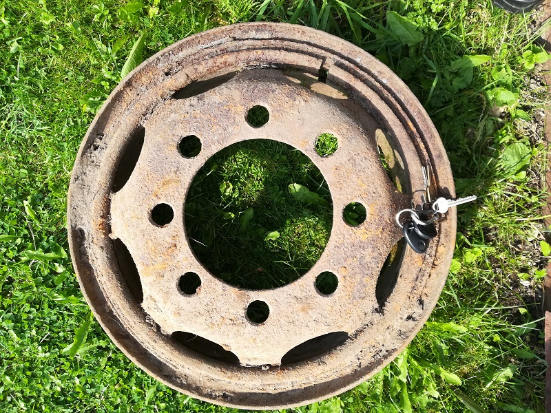 Metsa all vedeles järgnev isend. Alguses arvasin, et MB L3000, kuid nüüd pole enam päris kindel, kas see ikka nii on. Keskaugu diameeter on 21,5cm, velje diameeter 58,5-59cm, laius 21 cm. Poldiaugud on kuskil 3,3cm, poldiaukude vahe ca 7,2cm.