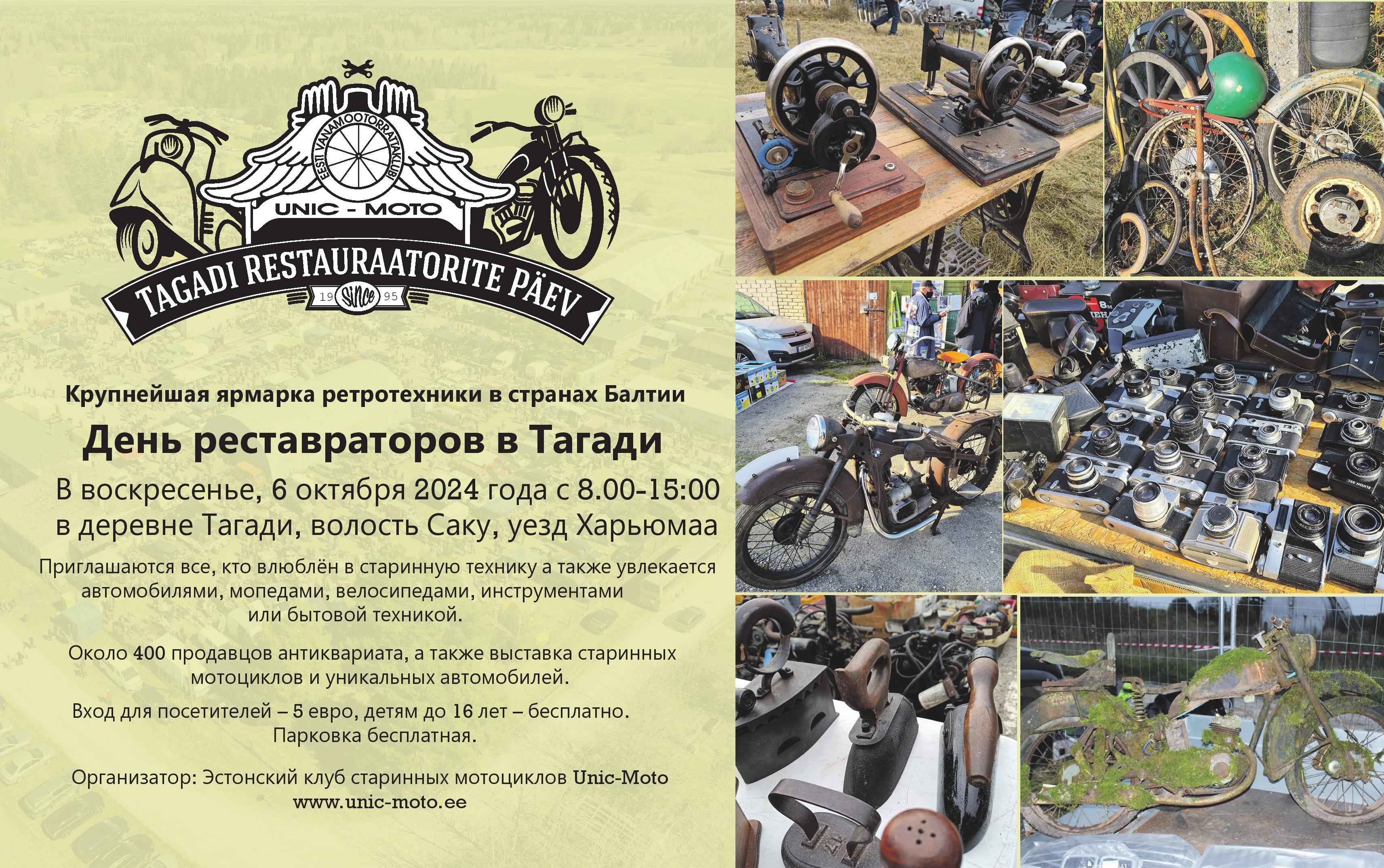 pühapäeval, 6. oktoobril 2024 kl 8-15 toimub taas Unic-Moto korraldatav Tagadi Restauraatorite päev, mis on mõeldud kõigile, kes on huvitatud vanatehnikast ja eriti mootorratastest. Traditsiooniline vanade autode näitus ja välja toodud ka mõned Balti Kett 35 üritusel osalenud tsiklid. Mootorratastele eraldi parkla värava ees! Meie laadal on enam kui 400 müügiplatsi ja sel korral kasutusel ka laiendatud laadaplatsi osa. Laiendasime platsi, kuna kaupleda soovijaid on rohkem kui laadaplatsil kohti. Kui garaazis ruumi vähe, pane osa kraami masina peale ja tule müüma! Kindlasti leidub keegi, kellel on just seda detaili vaja mis sinul aastaid garaazis kasutult seisnud.