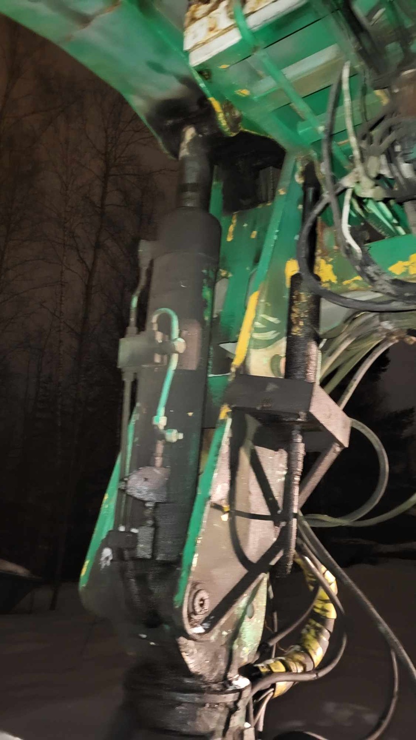 Kohale toodi vägeva 4teljelise kraanaga. Tõstis mulle maha ning sai hädapäraselt toestatud. Sellega oli aga kohe jama, sest kraana on mõeldud auto raamile kinnitamiseks ning ilma kinnitamata on äärmiselt ebastabiilne. Maapind oli too hetk märtsis külmunud, kuid sulas päevapeale ning see krdi jurapull käis oma raskesti tajutava massikeskmega tugede pealt külili maha. Noh õnneks mingit kahju sellest ei sündinud, hüdroõli lendas küll igale poole laiali.
